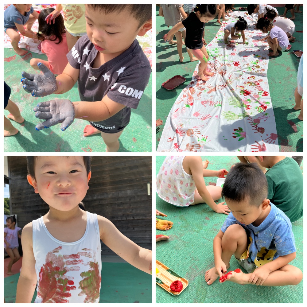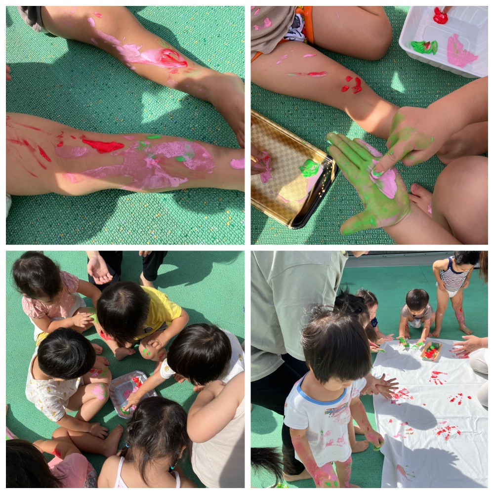 保護者の皆様に洋服を準備していただいたのに天候の関係でずっとできないでいた≪ボディーペインティング≫。22日に行なうことができました。「今日は、絵具を体につけたり、お洋服につけていいんだよ」と伝えると「いいの??」とちょっぴり不思議そう。でも、始めてしまえば大喜びで取り組んでくれました。