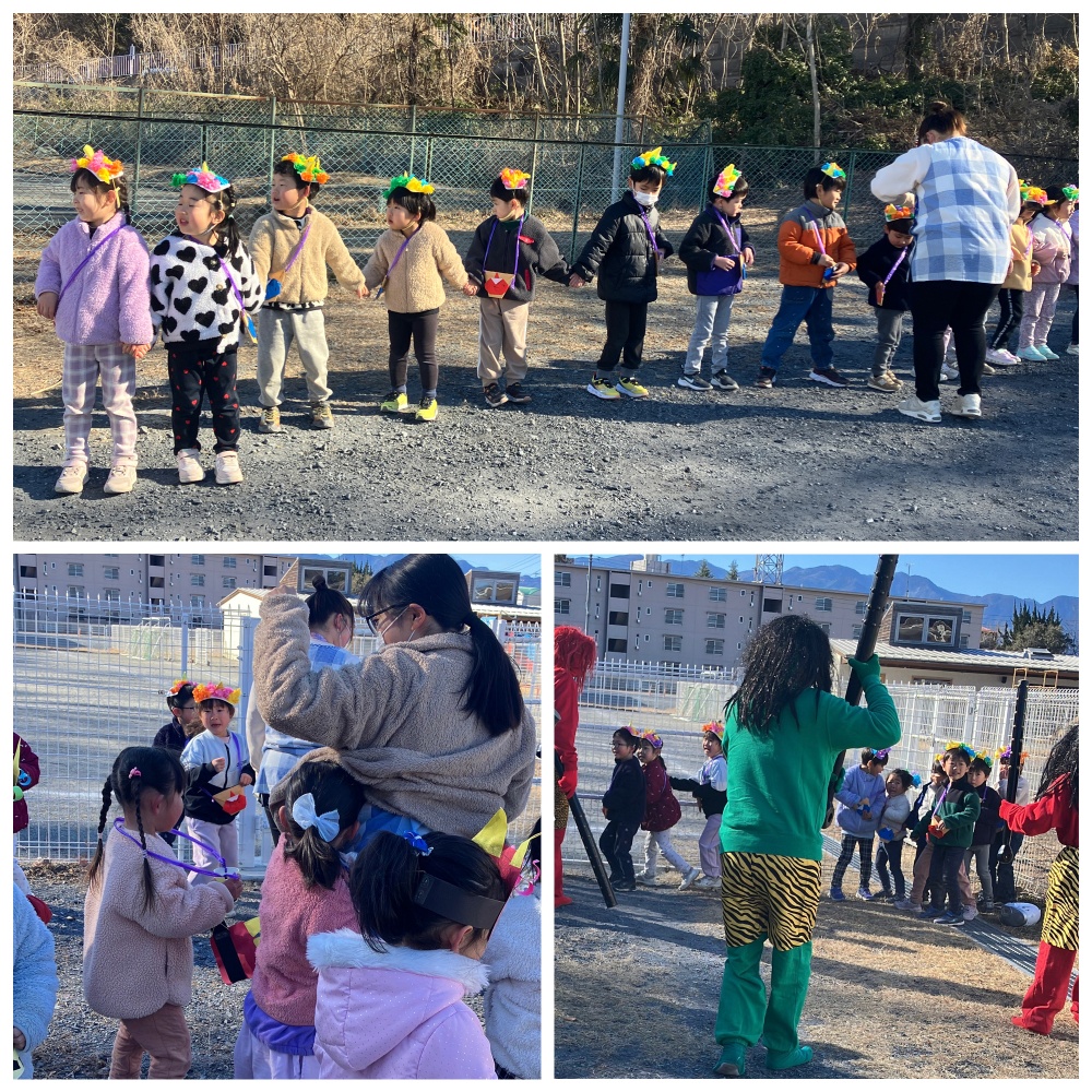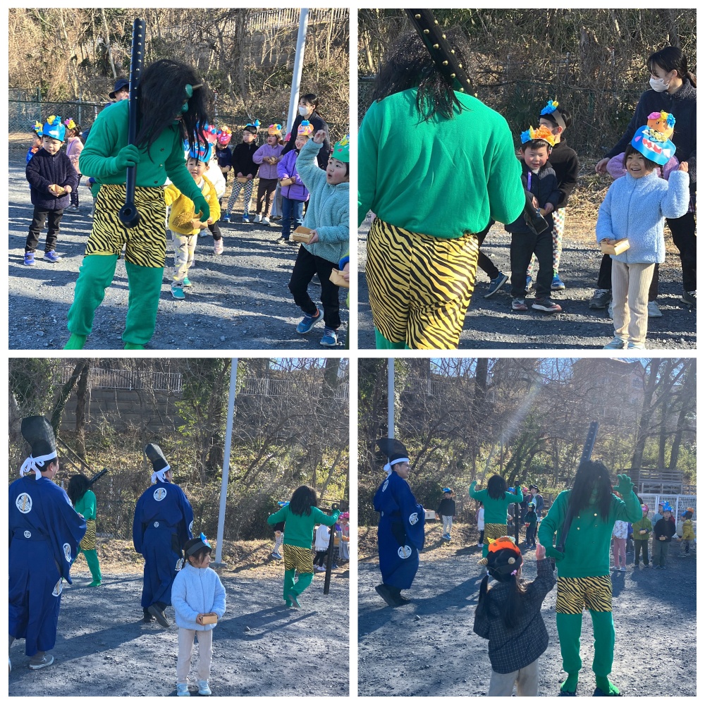 2月3日は節分の日。年少さん以上のクラスのところには 秩父神社からたくさんの鬼がやってきました。「最初は、こわくないよ!」なんて言っていたお友達も…やっぱり怖いですよね。こわいながらも 頑張って豆を投げていました。