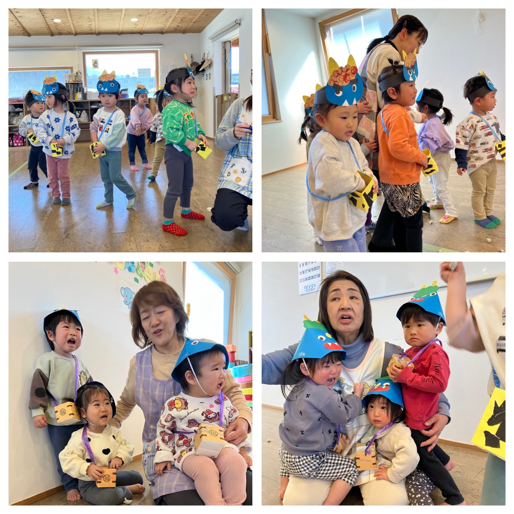 0.1.2歳クラスのお友達はお部屋の中での豆まきです。さっきの鬼さんとはちょっと違う鬼ですが…泣きながらも頑張りました‼